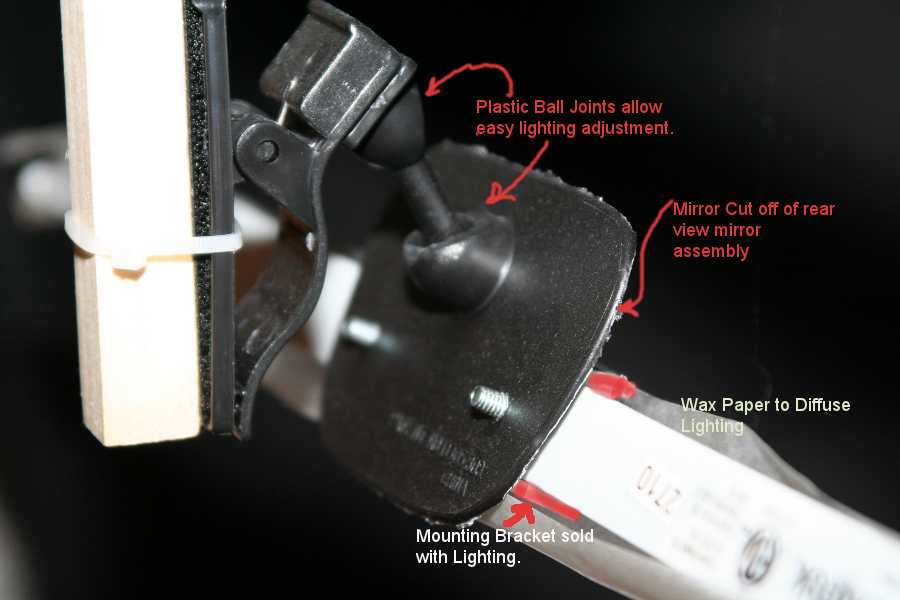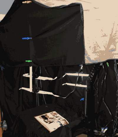 To get the correct angle on the cameras I resorted to placing a few business cards at the bottom of the camera where it pressed against the camera mount. This allows me to adjust slighting the angle of the camera. This worked out great until I loosened on of the cameras too much and it dropped on the platen. Luckily the camera and platen where unharmed. Now I have some old shoelaces holding the camera up in addition to the camera mount. Stupid looking but better safe then sorry. [photo]