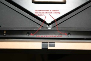 After switching out the lenses, I found that the self-centering mechanism was not functioning properly. As you move through the book, the spine should self-center saving you readjustment of the cameras. This needed to be raised a bit to avoid binding on the lower support beam. This is accomplished by loosening the bolts under the bottom book support.